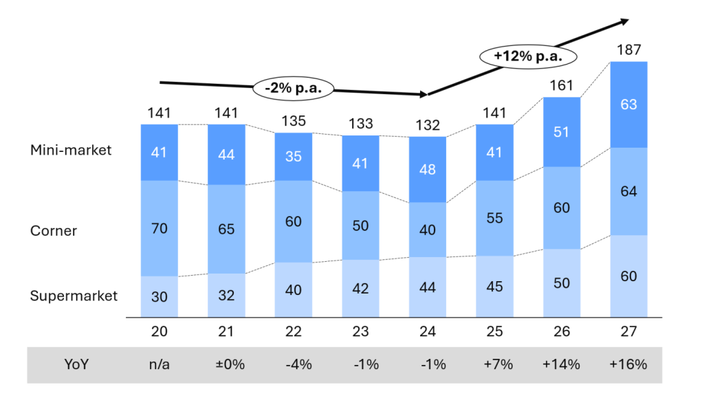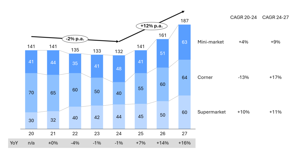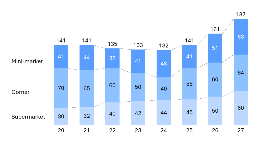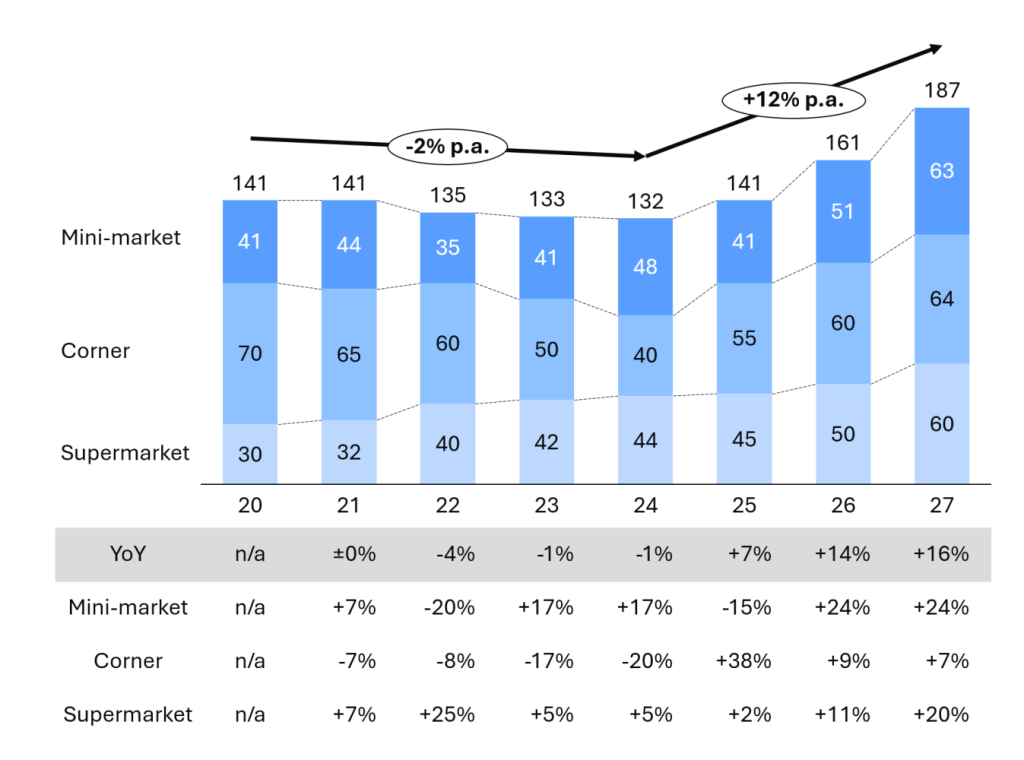 O resultado: uma tabela compacta, à direita do gráfico, com apenas três linhas (uma por segmento) e duas colunas (um CAGR por período). Simples, direto e revelador — especialmente quando os números mostram que supermercados cresceram mesmo durante o período de queda geral, enquanto lojas de bairro foram as principais responsáveis pela contração.